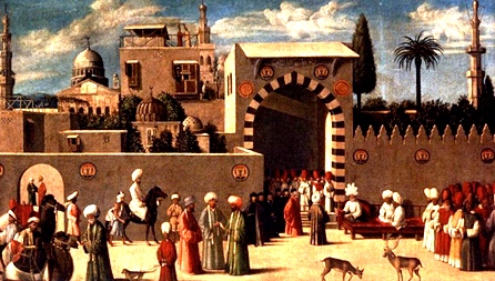 Uma tela de um pintor anônimo veneziano provavelmente do século XV e atualmente no Museu do Louvre retrata uma recepção dada em Damasco para embaixadores ocidentais. Nessa obra as referências à arquitetura da cidade são bastante conformes à realidade o que nos faz supor que ou o artista viajou com os europeus até à Síria ou teve acesso a desenhos de alguém que empreendeu alguma viagem semelhante e documentou o que viu. (Carmen Lícia Palazzo)